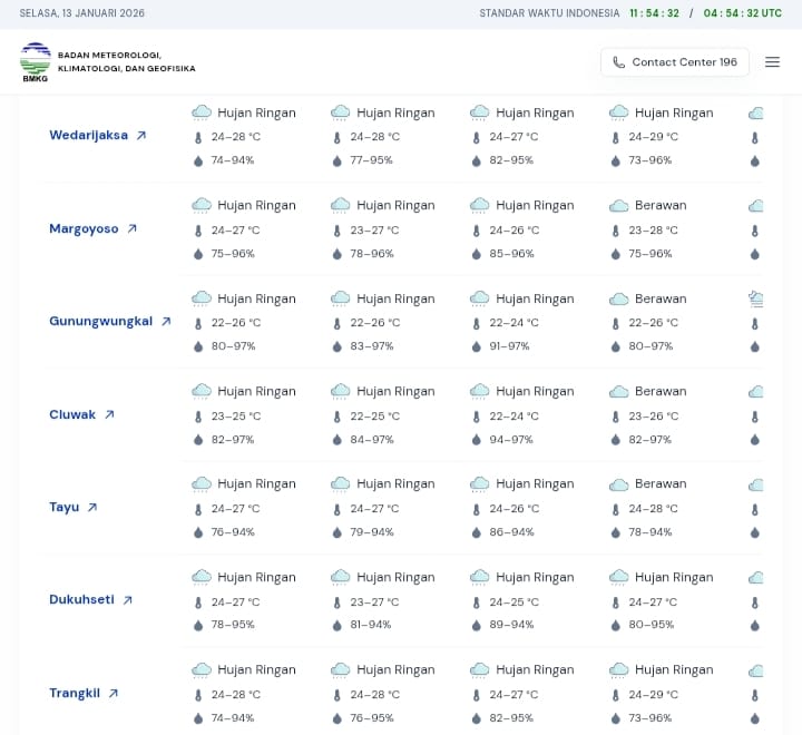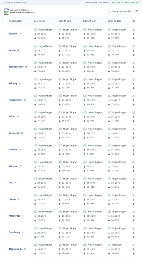 Pati,13 Januari 2026 – Badan Meteorologi, Klimatologi, dan Geofisika (BMKG) telah menerbitkan peringatan dini potensi hujan deras di Kabupaten Pati, Jawa Tengah, untuk wilayah dengan kode 33.18. Peringatan ini berlaku mulai hari ini hingga besok, dengan intensitas hujan yang diperkirakan mencapai 50-100 mm per hari, meningkatkan risiko banjir dan longsor di beberapa kecamatan. BMKG menyarankan masyarakat untuk tetap waspada dan mengikuti informasi terkini melalui aplikasi atau situs resmi mereka.